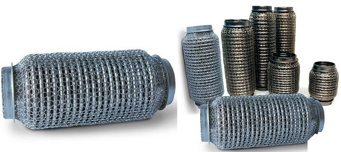 - Трехслойные с основой в виде гофрированной трубки. Верхняя оплетка – привычное плетение из нержавеющей проволоки, а вот внутренний слой – гибкий металлический рукав. Металлорукав снижает температуру гофрированной трубки и защищает от прямого контакта с выхлопными газами. Ходят такие гофры глушителя действительно долго, но для их сжатия и растяжения необходима немалая нагрузка. Из-за плотной компенсации вибрации от двигателя интенсивней передаются на резиновые демпферы выхлопной системы и кузов автомобиля. Приверженцами такого типа конструкции являются компании «Interlock», «Bosal».