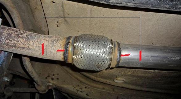 - Маркером или мелом на «штанах» вблизи прилегания старой гофры поставьте две соосные отметки. Еще две параллельные отметки необходимы для контроля общее длины после установки новой гофры. На деталях несложной формы этого вполне достаточно для того, чтобы после замены все элементы выхлопной системы стали на свои места без натяга и отклонений.
